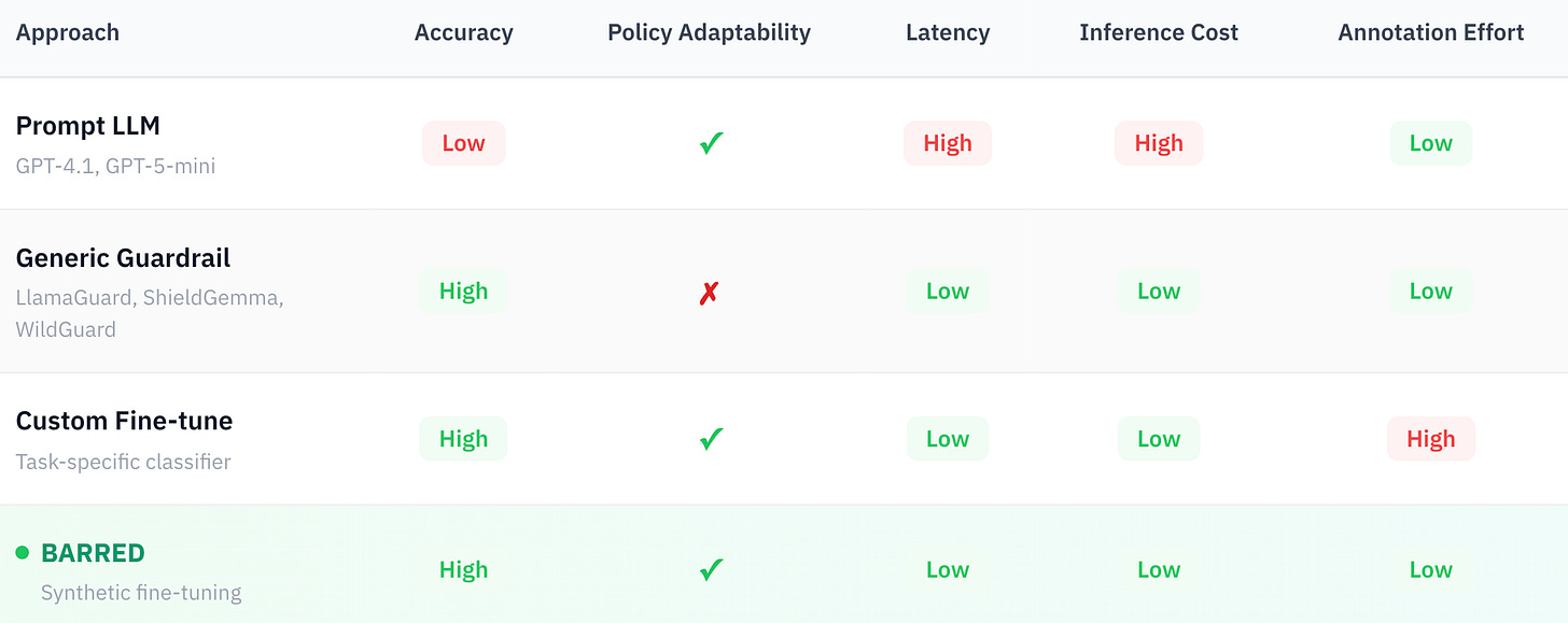 BARRED provides a path from a policy description to a production-ready guardrail classifier without requiring labeled data. The combination of dimension decomposition for diversity and asymmetric debate for label faithfulness produces synthetic training data of sufficient quality to outperform models with orders of magnitude more parameters.