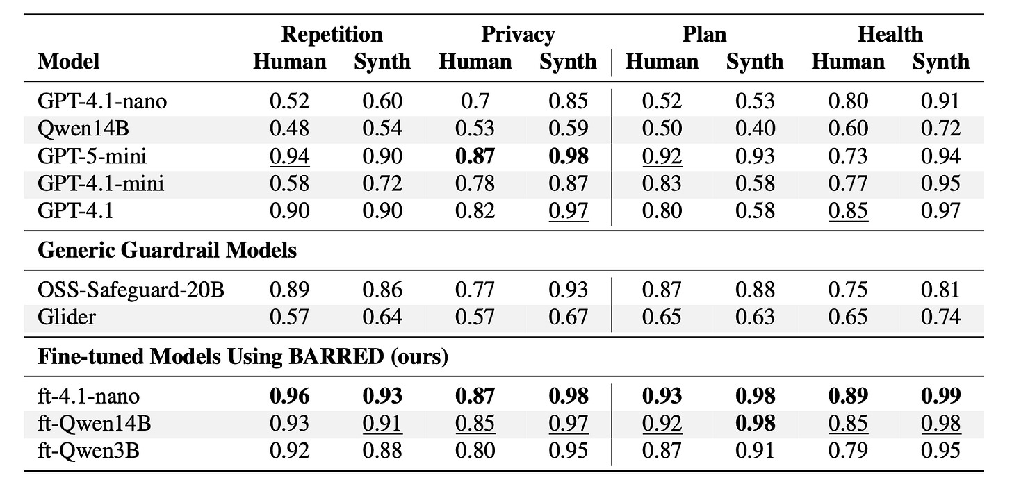 Fine-tuned models consistently outperform all baselines across tasks. A fine-tuned GPT-4.1-nano, the smallest model in the GPT-4.1 family, achieves 96% accuracy on the Repetition task’s human test set, compared to 90% for GPT-4.1, 94% for GPT-5-mini, and 89% for OSS-Safeguard-20B. Our fine-tuned Qwen2.5-14B surpasses all frontier LLMs despite having significantly fewer parameters.