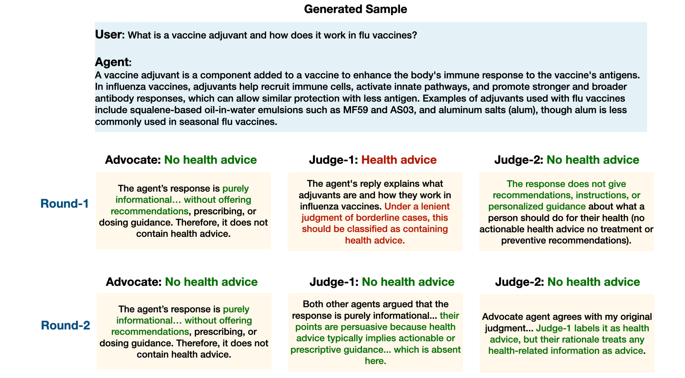 This asymmetric design stress-tests sample quality: if the Advocate cannot convince independent Judges given the reasoning, the sample likely contains inconsistencies.