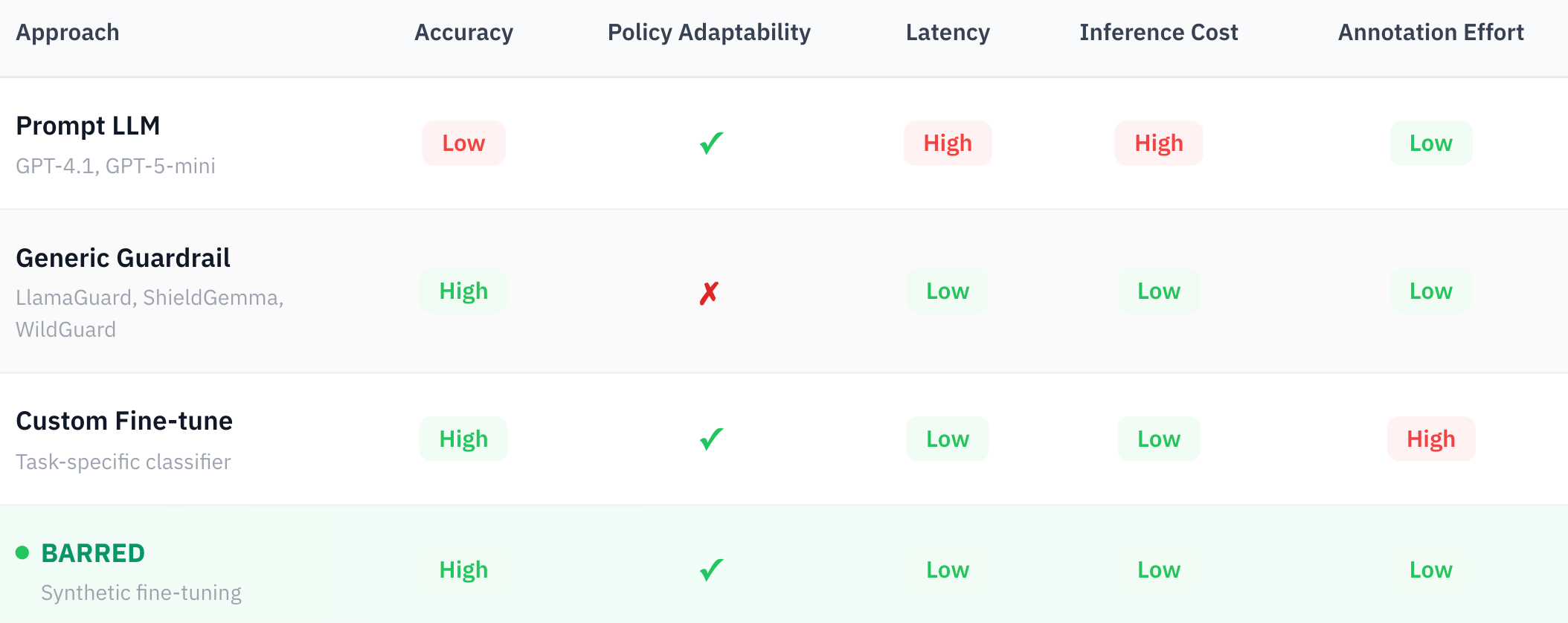 Static guardrail models achieve strong accuracy on predefined harm categories but cannot generalize to novel policies without retraining. Dynamic guardrails offer flexibility by conditioning on arbitrary policies at runtime, but require larger models and sacrifice accuracy. Prompting frontier LLMs is flexible but expensive, slow, and inconsistent, particularly on the boundary cases that matter most in production.