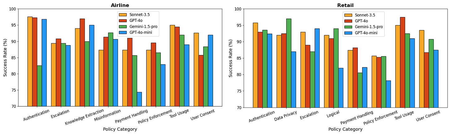 Performance trends revealed a decline as scenario complexity increased, from simple queries to multi-policy interactions. Notably, Gemini-1.5-pro outperformed GPT-4o-mini in low and mid-complexity tasks but aligned at high complexity, illustrating universal challenges in handling demanding scenarios.