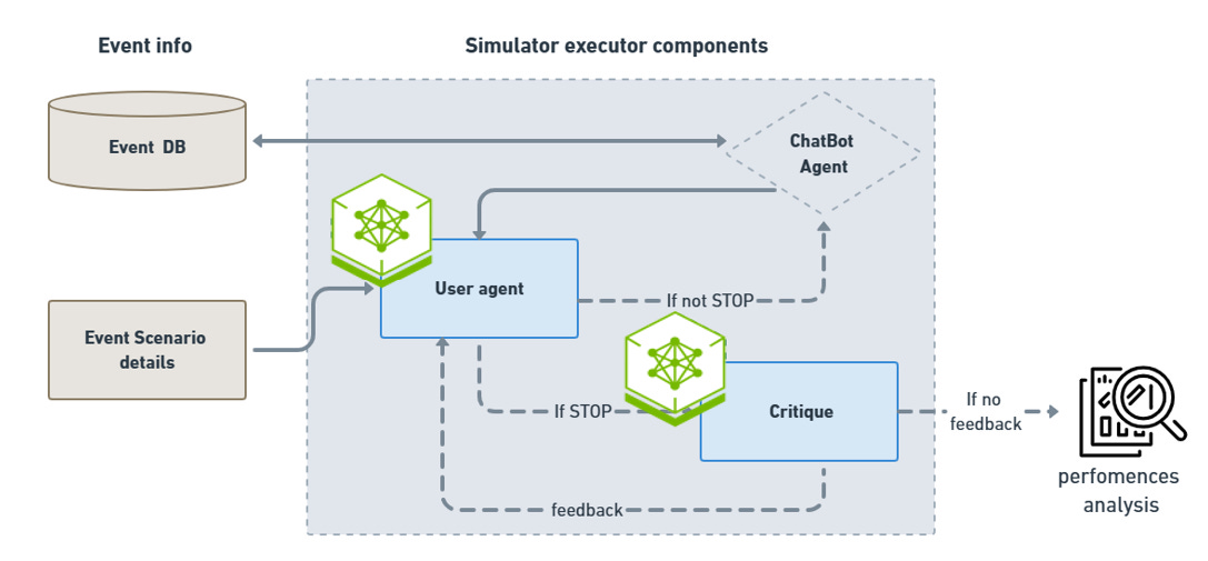 Simulation flow with event DB and scenario details streaming through user agent and critique feedback loop