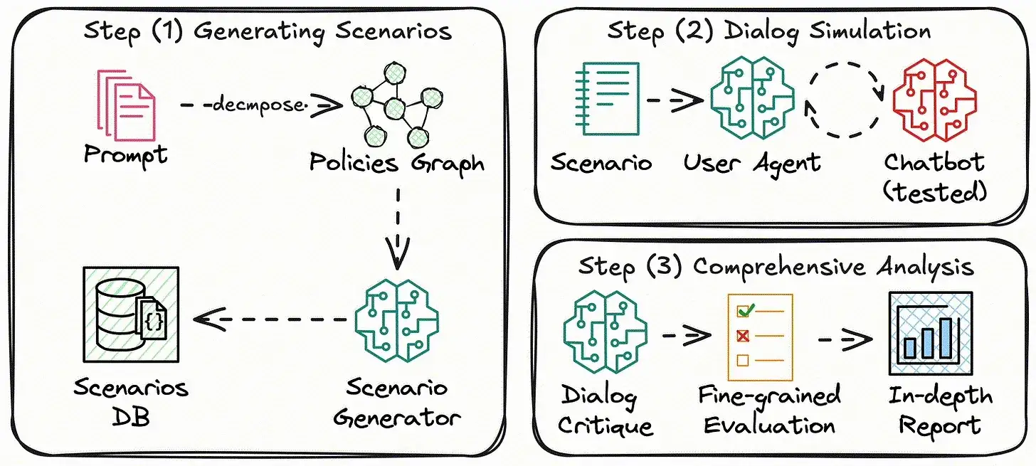 Diagram showing overall flow (1) generating scenarios (2) dialog simulation (3) comprehensive analysis