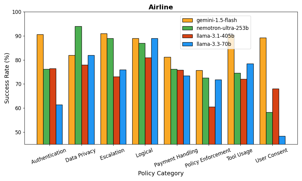 Table comparing Llama Nemotron Ultra 253b to other models. Each column showcases the success rate for a separate policy category (authentication, data privacy, etc.)