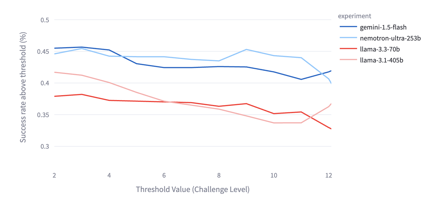 Figure 6: Comparison of Llama Nemotron Ultra 253b to other open source models; Challenge level increases along the y axis