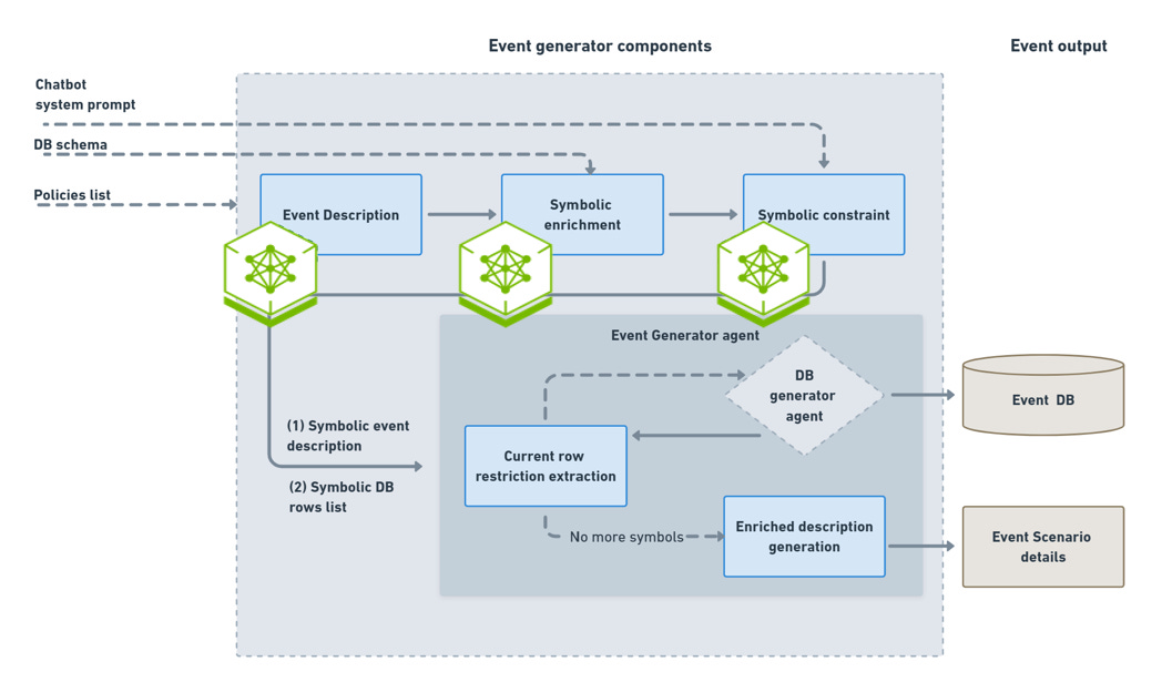 Event generation flow with system prompt, DB schema, and policies as input. This step uses NIM to generate the event DB and scenario details